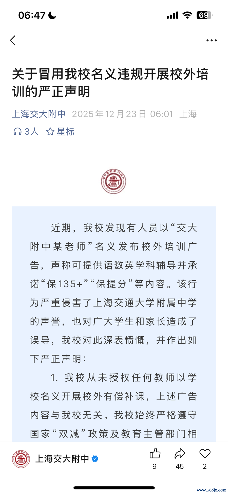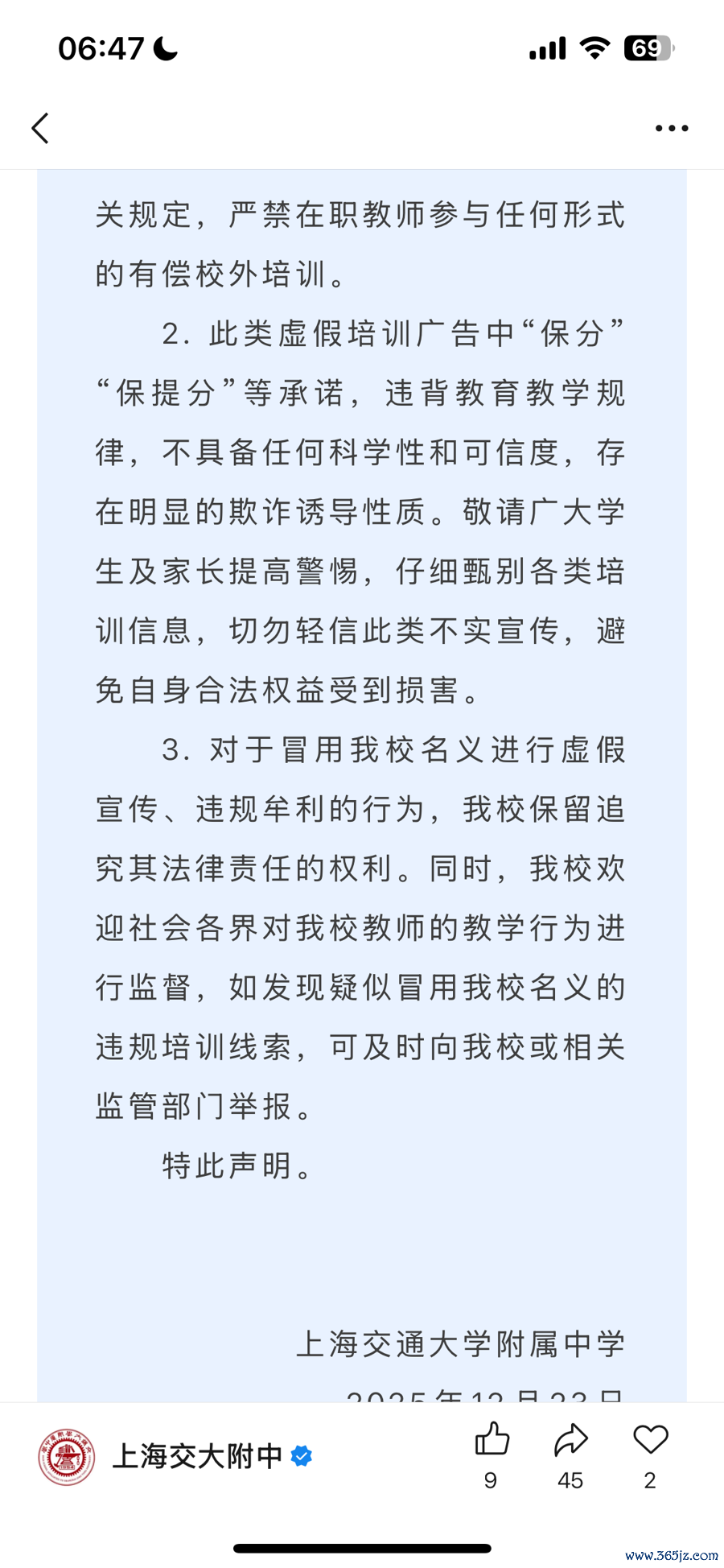 声明强调,上海交通大学附庸中学从未授权任何锻练以学校情势开展校外有偿补课,学校永远严格投诚国度“双减”战术及教导把握部门联系轨则,严禁在任锻练参与任何姿首的有偿校外培训。 针对告白中“保135+”“保提分”等吸睛甘愿,校方直言此类表述抵触教导教导法规,不具备任何科学性和真正度,存在昭着的诈骗指引性质。校方指示精深学生及家长,要提高警惕,仔细甄别种种培训信息,切勿轻信此类作假宣传,幸免自身正当权益受到损伤。 “‘保分’甘愿自己即是不靠谱的,学生的收成提高离不开自身竭力、学校教导和家庭教导的多方互助,哪有什么‘保过’的捷径?”一位初三学生家长在看到声光芒示意,此前曾对这类告白满腹猜忌,如今校方明确发声,也让大家吃了一颗“宽心丸”。 声明临了明确,关于冒用学校情势进行邪恶宣传、违纪渔利的行动,上海交通大学附庸中学保留根究其法律背负的职权。同期,学校迎接社会各界对锻练的教导行动进行监督,如发现疑似冒用校名的违纪培训陈迹,可实时向学校或联系监管部门举报。 业内东说念主士指出,周边期末,种种校外培训宣传参预活跃期,部分机构或个东说念主为领受生源,冒用名校情势、诬捏名师布景、作出邪恶提分甘愿等乱象时有发生。这次交大附中的声明,既是对自身声誉的调整,也为家长和学生敲响了警钟,指示大家警惕培训市集的“罗网”。